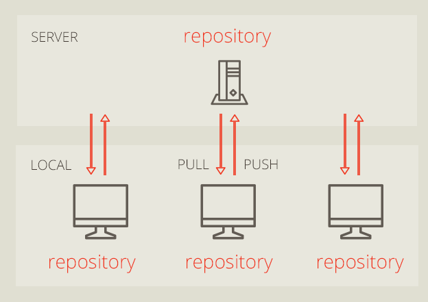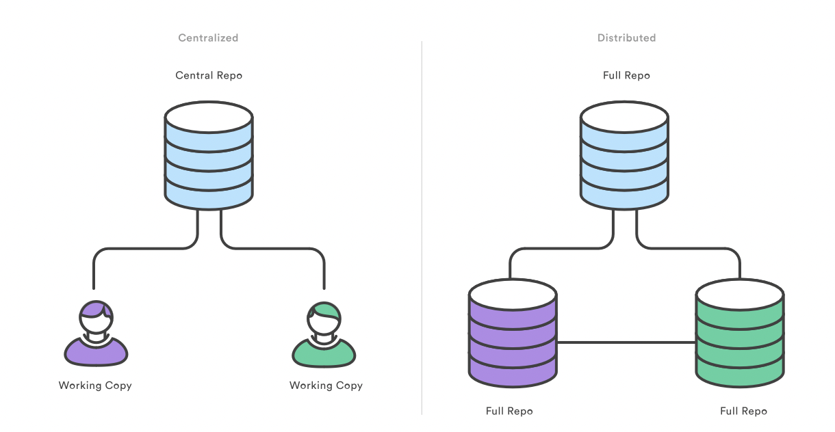 중앙 서버가 존재하지만, 다수의 Client 들은 각자의 컴퓨터 저장소에 중앙 서버의 전체 사본을 가지고 작업하는 것을 의미한다.