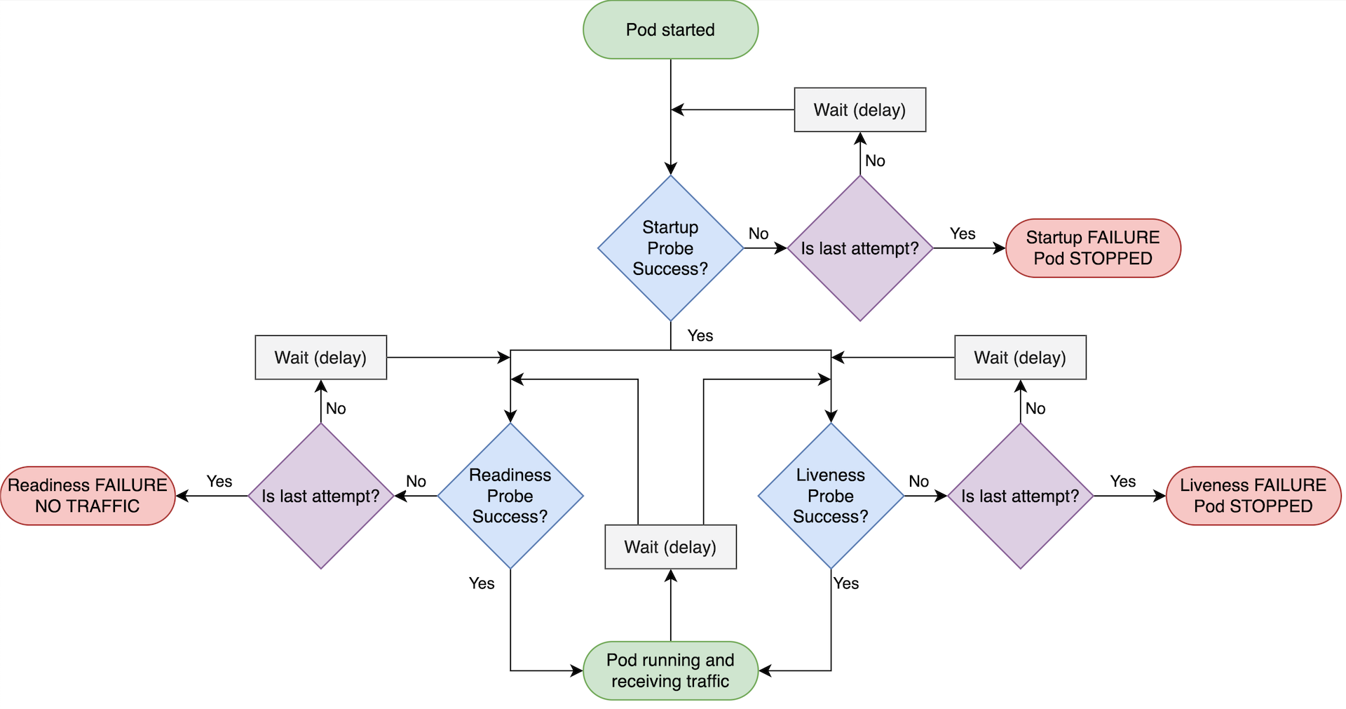 - 시작되지 않은 경우, Kubernetes는 해당 컨테이너를 종료하고 재시작한다.